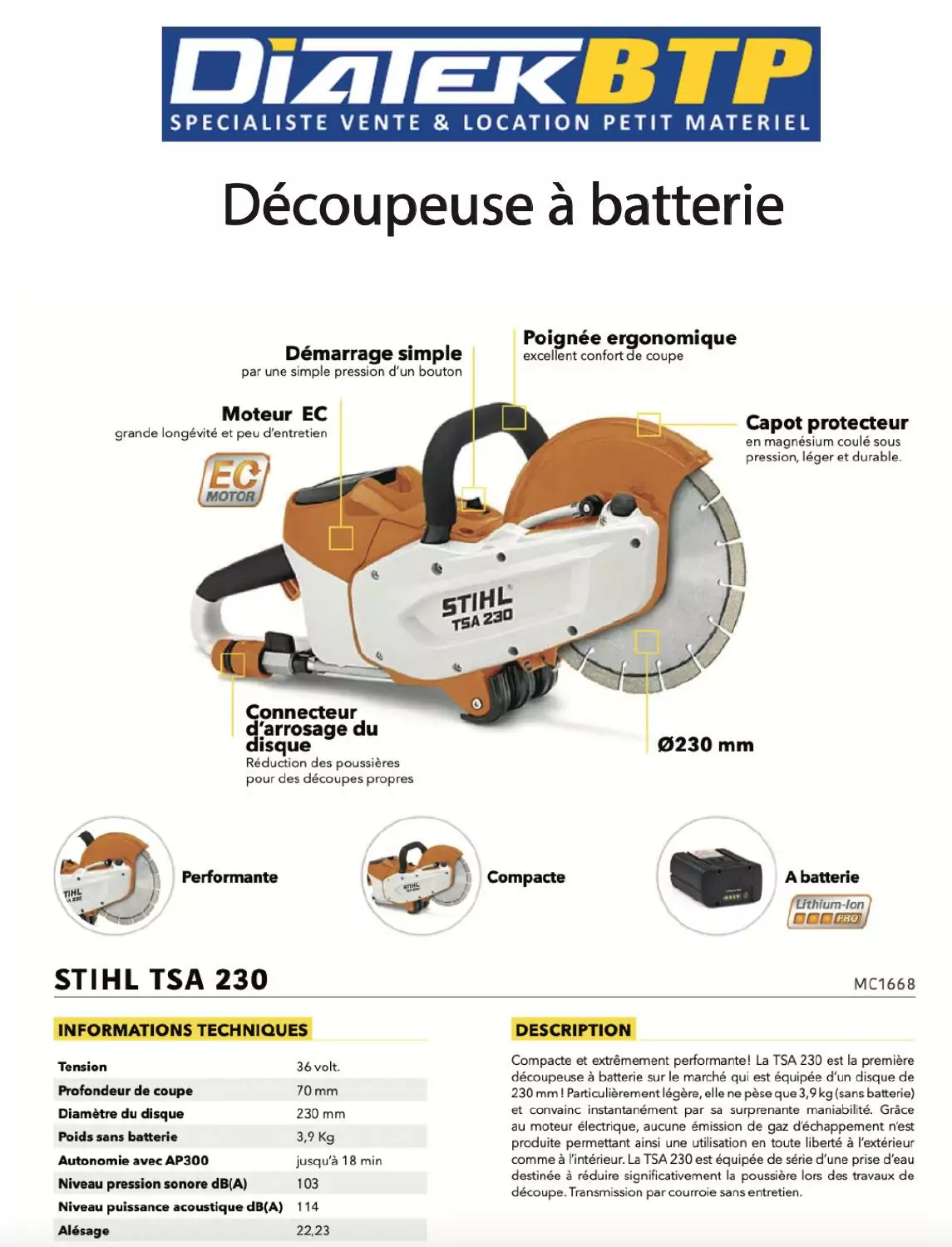 Diamètre 230 Découpeuse Béton 230 Mm Milwaukee 230 Poids sans batterie (kg) 6,2 Diamètre du disque : 230 mm Profondeur de coupe : 85 mm View